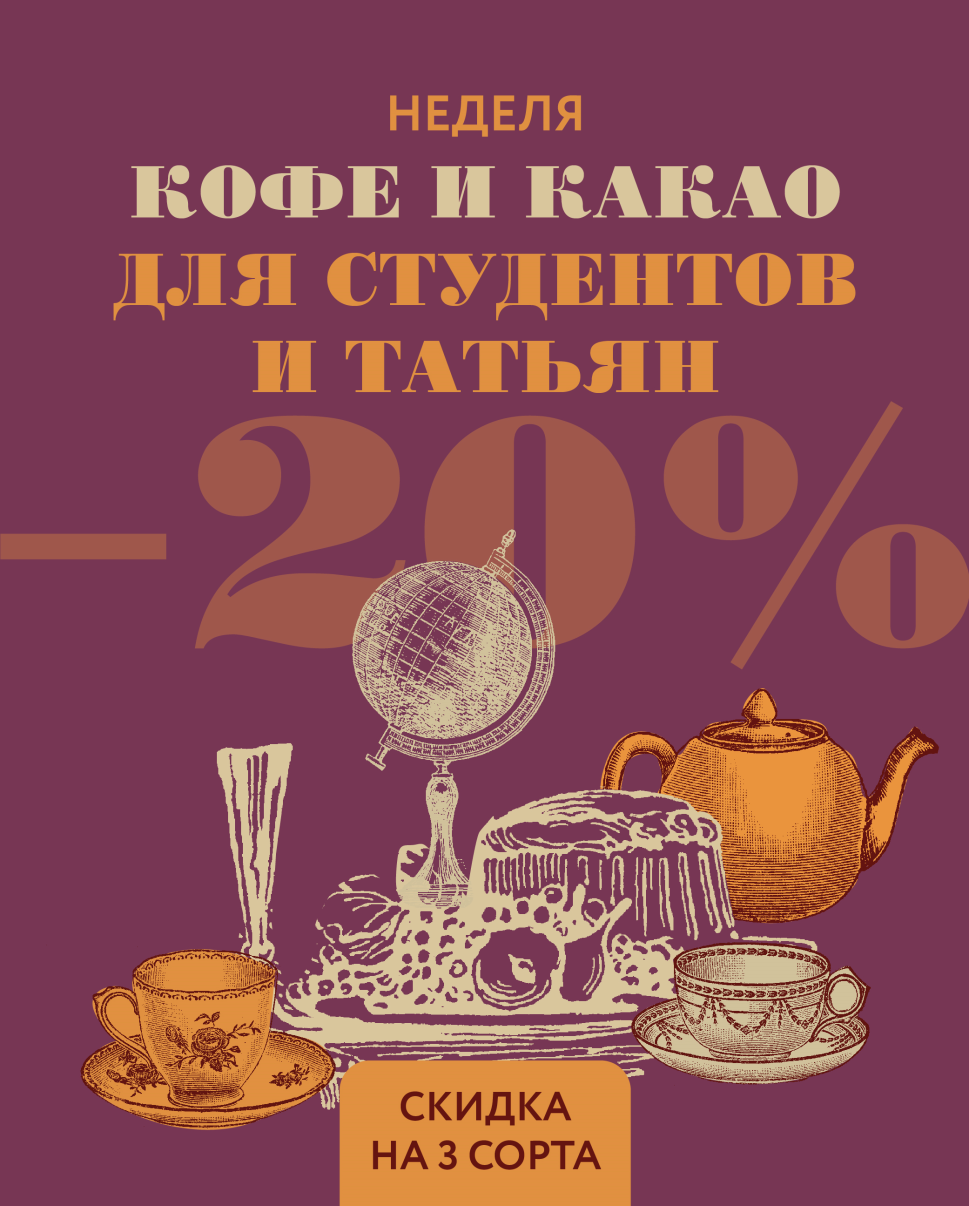 Вдохновились Днём студента и сделали скидку 20% на кофе и какао для дружеских вечеринок и уютных посиделок. Три сорта сделают вечер с друзьями еще теплее, превратив его в ценное и вкусное воспоминание. Скидка действует до 25 января.